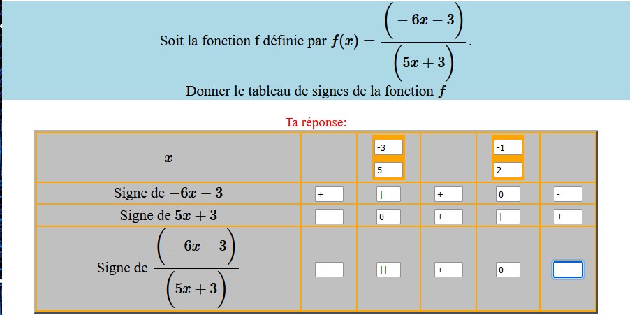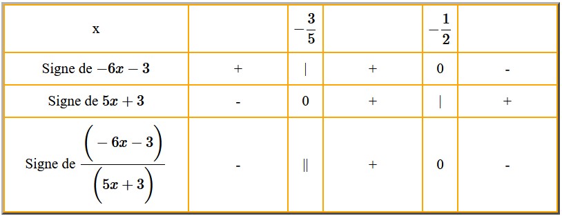 Soit la fonction f définie par $ f(x)=\dfrac{\bigg(-5x-9\bigg)}{\bigg(-4x+3\bigg)}$. Donner le tableau de signes de la fonction $ f$